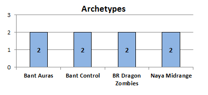 These decks will both have to dethrone the King of Standard Aggro: Rakdos (red and black). BR Dragon Zombies still has plenty of game and the faster “Rakdos Deck Wins” style decks also continue to have potential. Bant Auras is an aggressive deck that greatly limits an opponent’s ability to interact and should continue to find pilots willing to take advantage.