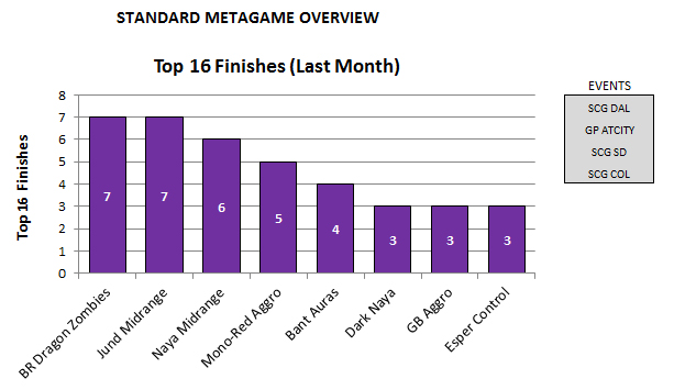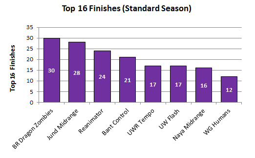 The following graphs track the deck archetypes with the most top 16 finishes at major Standard tournaments. The top graph shows results in the last month, and the bottom shows results since Return to Ravnica rotated into the format in October of 2012.
