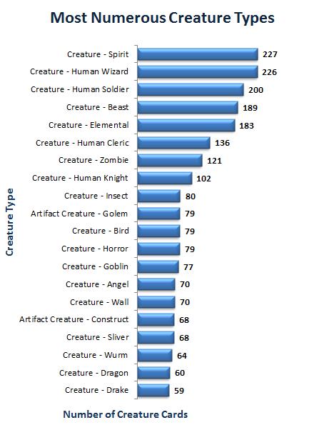 Spirits just narrowly edge out Human Wizards thanks to the tribal attention of the Innistrad block. Fear not, Human tribal fans; Humans are by far the most populous single type in Magic. Four of the top eight combinations and 21% of all creature cards include Human in the creature type.