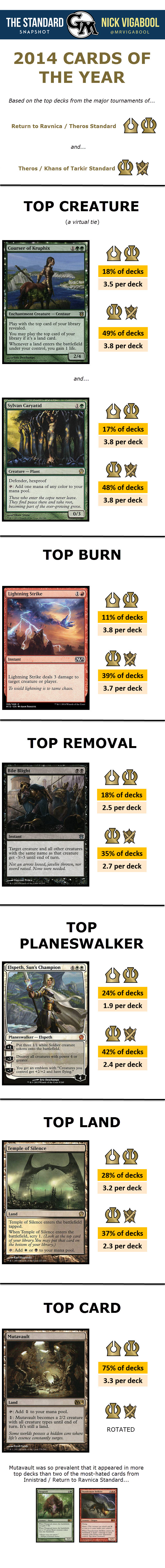 Main » Articles » Standard Snapshot: 2014 Cards of the YearStandard Snapshot: 2014 Cards of the Year By Nick VigaboolPosted on December 24, 2014 Reddit TAGS articles, standard, constructed, review, data, infographic, nick vigabool, cards of the year