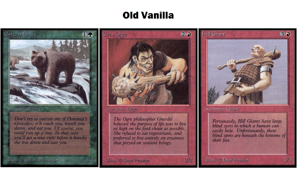 Vanilla creatures have no abilities and no rules text—just power, toughness, and converted mana cost. The recipes for many vanilla creatures were first put to cardboard at the beginning of Magic.