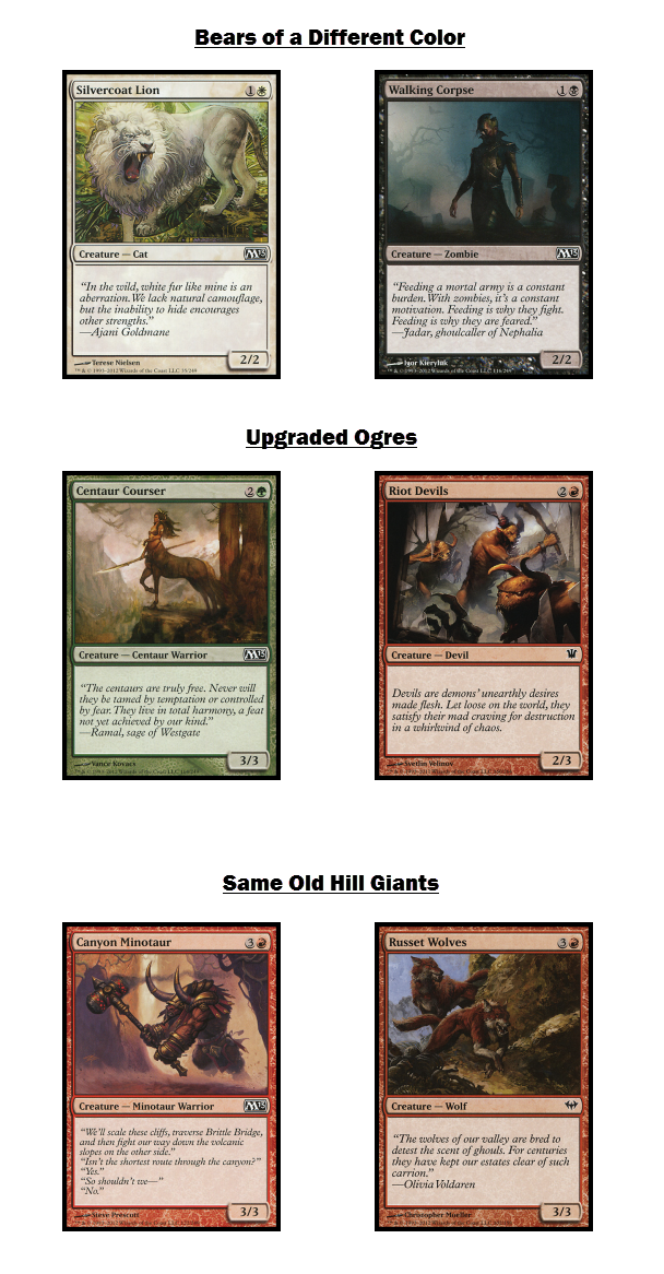 These older recipes are iconic. Creatures that cost 2 for a 2/2 are frequently referred to as “bears,” whereas a 2/2 for 3 is a Gray Ogre. Some of these recipes have changed over many years and multiple expansions, though others have stayed the same.