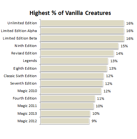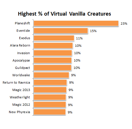 Return to Ravnica is on this list, and Dark Ascension is not far behind at 7%. Virtual vanilla creatures frequently see Constructed play and serve important roles in competitive decks. There are fifty-three Standard-legal virtual vanilla creatures, and about 30% of them have been included in a Top 16 deck.