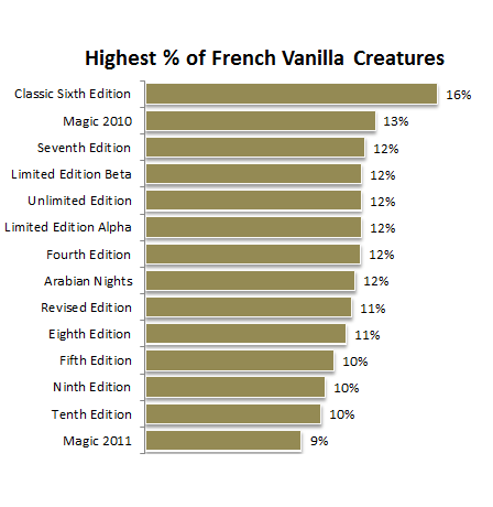 Check out the graph below showing the sets with largest number of French vanilla creatures.