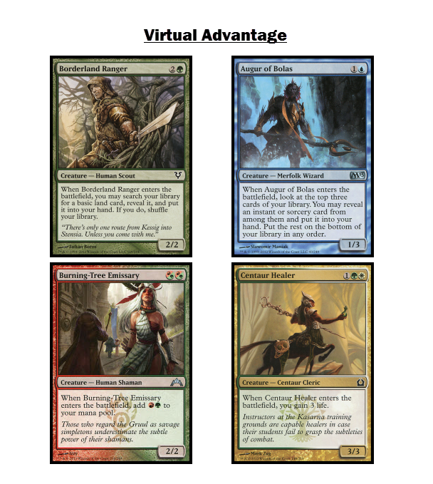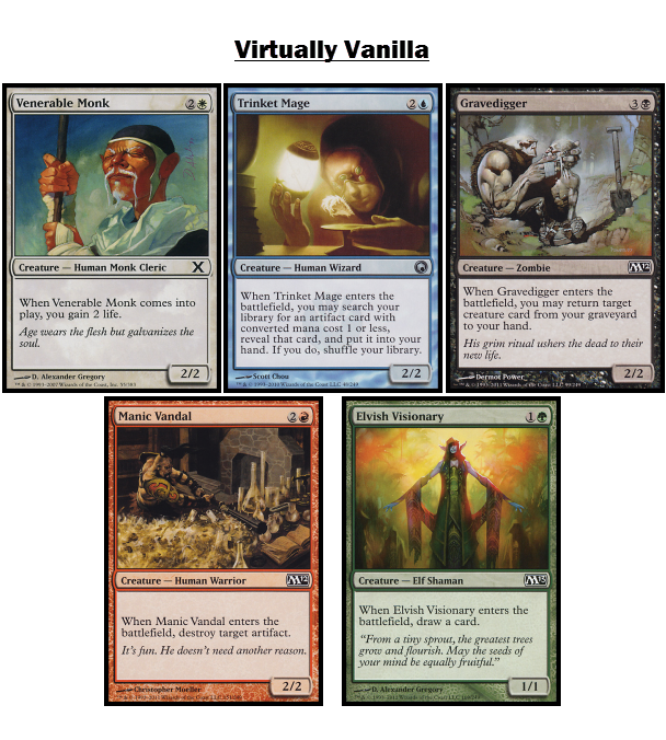 Virtual vanilla creatures are important because they can have a significant impact on the game without substantially increasing its complexity. Once an enters-the-battlefield ability resolves, the creature is vanilla and much easier to account for on the battlefield. Enters-the-battlefield abilities are also a way to emphasize creatures in Magic, ensuring that they provide some value even if they are destroyed immediately by a Doom Blade, Lightning Bolt, or similar effect.