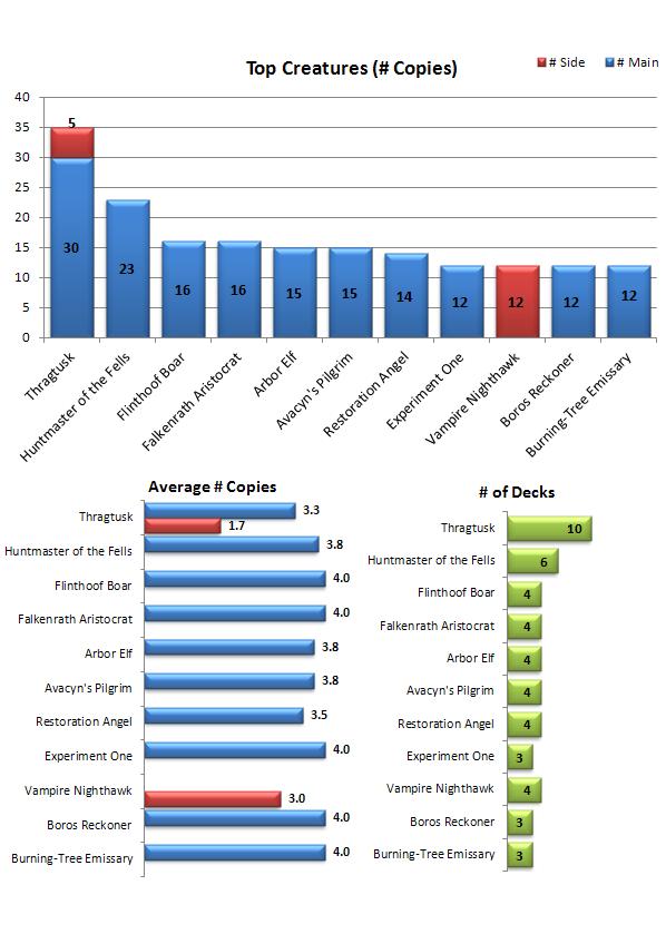 Thragtusk has weathered set after set since rotation and still remains on top. In Nashville, the big Beast of Standard was played in ten decks and seven different archetypes—now that’s format-warping! Here is the archetype distribution of these top cards with the average numbers played for each.
