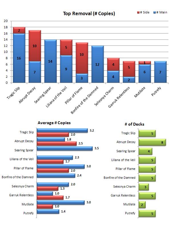 A lot of Jund-flavored removal spells at the top in Nashville. Abrupt Decay was in half the Top 16 decks, largely in the sideboard, and it handles many of today’s aggressive threats quite efficiently. Here is the archetype breakdown for these spells.