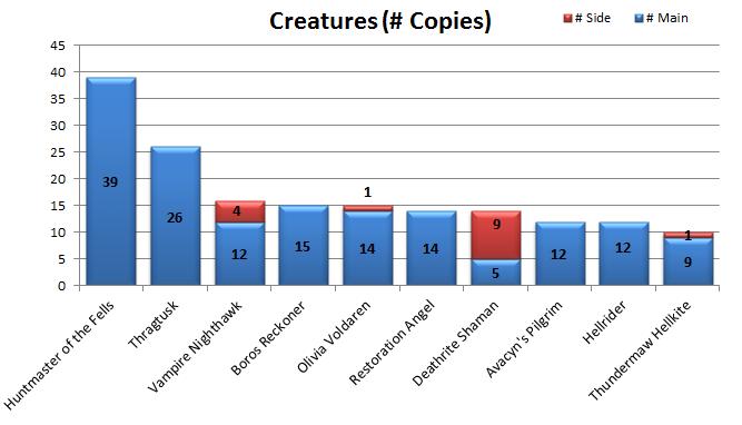 Huntmaster of the Fells is a popular chap, finding a home in main of ten decks across five different archetypes: the first-place Naya Humans, Naya midrange, all five Jund midrange, both Human Reanimator, and four-color tokens.