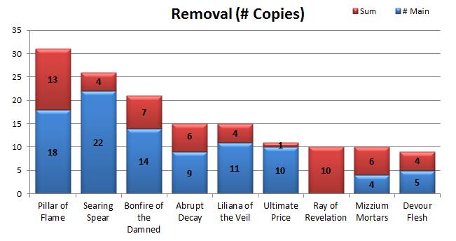 Ten decks played Pillar of Flame, including all five Jund midrange decks, both Naya Humans, mono-red aggro, Boros aggro, and R/W/U Flash. Zombie terror has died down, and we see a near even split between the main and side for the card. If Human Reanimator picks up steam, Pillar may swing back to the main deck to exile Huntmaster of the Fells and Cartel Aristocrat.
