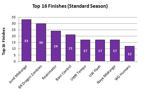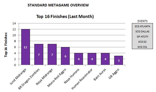 The following graphs track the deck archetypes with the most top sixteen finishes at major Standard tournaments. The top graph shows results in the last month, and the bottom shows results since Return to Ravnica rotated into the format in October of 2012.