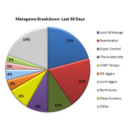 Competitive Standard took a week off for prerelease fun, so these results contain one fewer tournament than normal. Jund Midrange and Junk Reanimator are still neck and neck battling it out for the top deck of the metagame with Esper Control, The Aristocrats, and UWR Tempo as the main challengers.