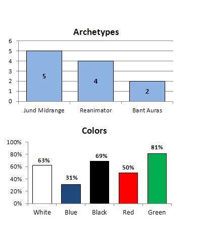 | Voice of Resurgence | 15 | 6 | 9 | 5 | Bant Auras (4th and 11th place); Reanimator (7th place); Bant Control (12th place) |
