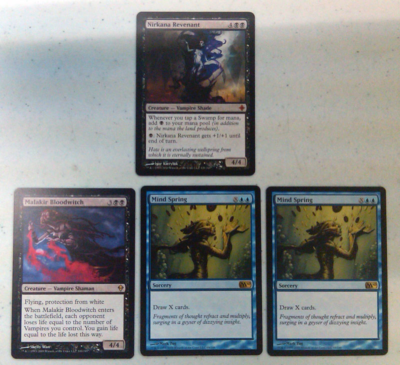 Mindspring has been enjoying lots of play and Patrick Chapin says that it's one of the few "good" blue cards in Standard. I picked up two more in this next trade. I also scored a Malakir Bloodwitch, the Bloodwitch is a Jund sideboard card and that means that it will move quickly. This was the strongest trade of week because these cards frequently appear in Top 8 decklists.