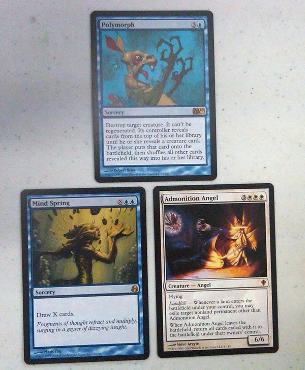 Let's switch gears here and look at some gains. Polymorph is really hot right now, so it's easy to pick up value on it. I got the Admonition Angel because it sees a little play in the mythic sideboard, it's an Angel and it's a Mythic Rare. No one cares about Admonition Angel; he valued it at two bucks and the Mind Spring at a buck.
