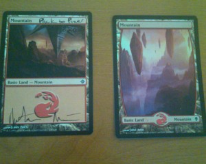 My first trade of the week was a no-brainer. They offered me a Foil Full Art Zendikar Mountain for my Pack Mountain, signed by me, of course. I knew my signature would be worth something some day, approximately the difference between a ROE basic and a Zen foil mountain. Yeah, I know the trade was lopsided, deal with it folks. I am not going to walk on egg shells for this whole project. The purpose is to have fun by doing the seemingly undoable.