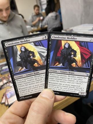 With the cards getting into players' and store owners' hands in order to provide singles, some odd discrepancies were discovered in card arts, as was initially reported on Reddit. The two cards most visibly displayed were two different versions of the card Clandestine Meddler, where one had red curtains (this is the official art on Wizards' web page) while another had white curtains. A couple other cards were mentioned in the comments, including Sudden Setback, Case of the Gorgon's Kiss, and Case File Auditor. None of these cards have any differentiating indicators aside from these visual differences. It's likely that these have to do with the ongoing ARG puzzle for the set, so keep your eyes peeled for any others!