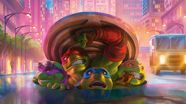 Another common element of Universes Beyond sets are the scene arts. These return for TMNT with a handful of cards appearing with artwork that forms a giant piece when you put them all together.
