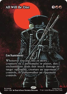 Several mythic rares also receive a special borderless treatment, depicting a variety of characters in the form of a silhouette. There are eight of these in all - that have been revealed, at least. Each one can be found in all booster types, though there are a set of special surge foil variants exclusive to collector boosters.