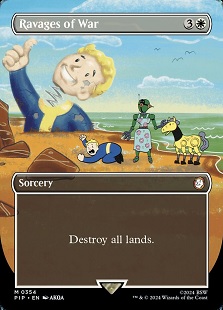 Universes Beyond: Fallout was previewed in full over the course of the previous week, showcasing all kinds of new cards from throughout the entire series. Fans of the Fallout games were excitedly losing their minds over seeing their favorite events, characters, and settings being brought to life in the form of Magic: the Gathering. These previews began last Tuesday and finished at MagicCon Chicago. Even if you're not a huge Fallout fan, there's still plenty of cool cards to be had here, such as the first ever non-judge foil reprint of Ravages of War.