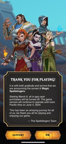 Magic Spellslingers - a retooled version of Magic for mobile devices - has announced its end of service on June 4 of this year. As of this past Wednesday, players may no longer make purchases in the game's store. Players who linked their accounts to their MTG Arena account reportedly found 1500 gems waiting in their Arena inbox soon after this announcement as a thank you for supporting the game.