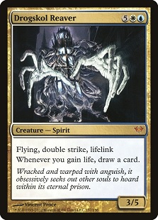 There were a lot of really sweet cards that stood out to a number of players when Dark Ascension came out, but one that caught the attention of many was Drogskol Reaver. This huge spirit is awesome in its simplicity. It's elegant enough that it reads almost like a French vanilla creature, yet has some subtle depth to it that makes it highly appealing. In this case, it's the interaction between double strike and lifelink alongside the second line of text allowing you to draw cards. By hitting twice, it allows you to essentially draw multiple cards per hit. From there, it also lets you draw even more cards if you gain life by other means! Drogskol Reaver never made a massive impact in the game, but was nonetheless a really cool design that got players excited for all the right reasons.