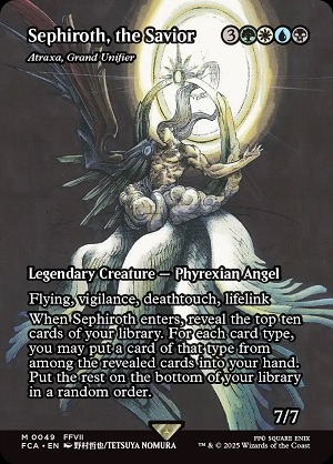 Several cards were also revealed to feature all-new art by a variety of beloved Final Fantasy artists. Naturally, this includes the long famous names of Yoshitaka Amano and Tetsuya Nomura providing stunning art on the likes of Terra, Magical Adept // Esper Terra and Sephiroth, Fabled SOLDIER // Sephiroth, One-Winged Angel. However, this also extends to other major artists for the series, with Akihiko Yoshida, Isamu Kamikokuryo, Roberto Ferrari, and Kazuya Takahashi all presenting special treatments to select cards.
