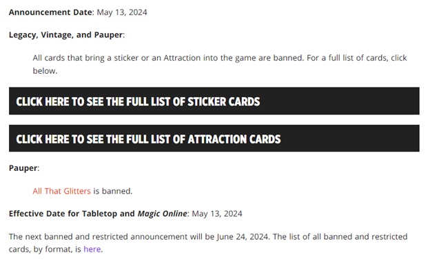 The stickers and attractions ban only impacts these competitive formats though as of this time does not impact the Commander format. Commander Rules Committee member Jim Lapage noted that there were no intentions by the RC to ban them in the near future either. Jim additionally noted that the RC was working on trying to put together a list of silver-bordered cards that could be allowed for Commander play.