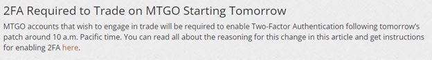 Following continued issues with players getting their accounts hacked and emptied of all their contents, Magic Online announced changes to their trading process. Now in order to be able to trade cards between accounts, you must set up two-factor authentication on your account. This is for security so that it makes it more difficult for people to steal your goods out of your account in the event that you get hacked, thereby making it easier for the MTGO team to get you access back. Be sure to check all the details for this change here.