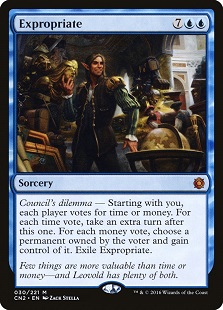 If you want all of your friends to hate you, try casting a copy of Expropriate in a game of Commander and watch the whole table groan loudly around you. There was a time when the card was reaching $70 before its eventual Mystery Booster reprint, and while it was good to see the card's price drop, the extra availability had players less than thrilled. While it's really powerful in Commander, I'm keeping the ranking lower here simply because it's just hated that much amongst the casual audience.
