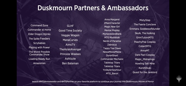 During the Weekly MTG stream on this past Tuesday, Wizards announced the latest MTG Ambassador class for Duskmourn: House of Horror. This lineup includes dozens of beloved Magic content creators who love showcasing what the game has to offer. Further details on the MTG Ambassador program can be found here. Congratulations to this new class of creators!