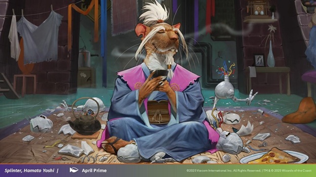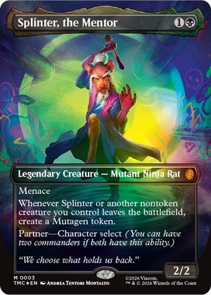 We also were shown the one Mono-Black partner of the deck: Splinter, the Mentor. This provides one color for each character across the team so that they're all represented.
