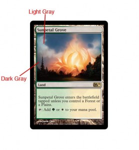 For starters, let's talk about your materials and workstation. I use acrylic model paints in my work. These paints are specially formulated to dry as flat as possible, and they're available in a huge variety of colors at most game and hobby shops. For brushes I use a couple different sizes of synthetic/sable blend brushes (let's say one is medium-small, and the other is very small). These aren't the most expensive brushes you can get, but they aren't exactly cheap, either. Just remember this about brushes- the less you spend on a brush, the more time you're spend fishing loose bristles off of your painting. I also use an old ratty brush for drybrushing, a palette knife (anything from a plastic butter knife to a popsicle stick will do the same job) and a cheap plastic paint palette for mixing. I usually hold the cards carefully while painting, or set them on a clean paper towel.