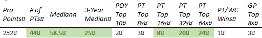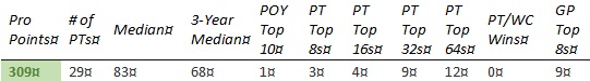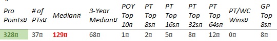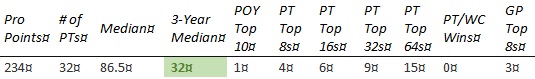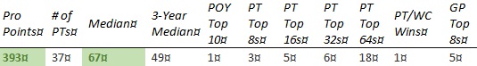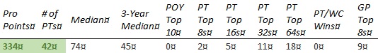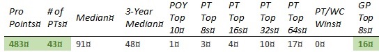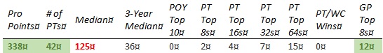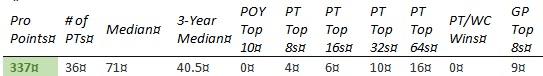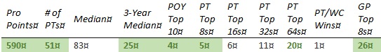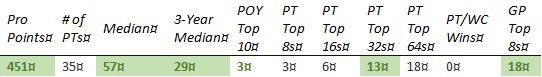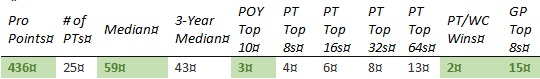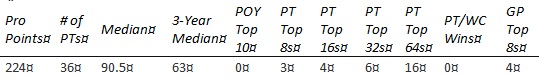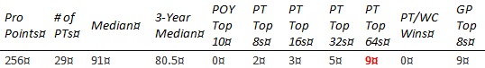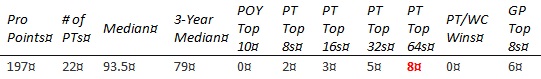 Chris is short on PT Top 8s and none of the other results jump out enough to compensate. The past year hasn't gone well, with his best finish coming in teams at PT 25th Anniversary (81st) and no GP top 8's.