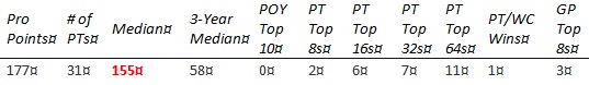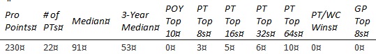 The large number of PTs played can help explain the worse career median. Everything else looks like a pretty solid case for the PT HOF. Not necessarily a slam dunk, but what we have here is a viable candidate. Ikeda's case really brings the longevity vs dominance issue up. He was obviously quite skilled- qualifying for that many PTs doesn't happen by accident. Are those Top 8s and Top 16s the result of dominance, or are they just what happens when a very-good-but-not-great player plays in almost 60 PTs for a game with its fair share of variance?
