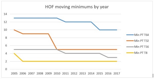 Long story short, the HOF standards have been changing ever since the HOF began, and they'll continue to change as the PT evolves. Here's where they are as of this year: