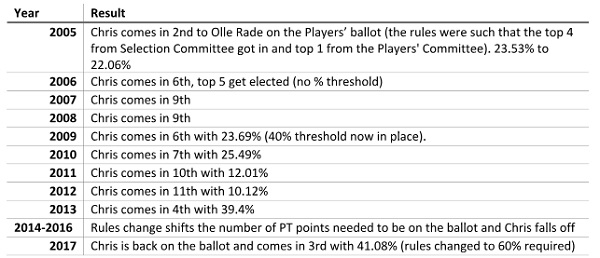 Where to start? There are 2 camps with Chris and the Hall of Fame: Those who believe his numbers aren't up to par so there's no reason discussing anything else, and those who believe his numbers are enough to get him into the conversation and his contributions to the game beyond that move the needle. He's a very divisive figure when it comes to Hall discussions. Look at his voting history: