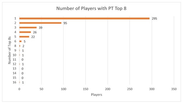 5 is a lot of PT Top 8s. It is. Only 33 people have ever gotten that many. Even though it looks like the HOF voters are less worried about inducting people with 4 or 3 top 8s, 5 still is something special. Here's a look at how many people have each number of top 8: