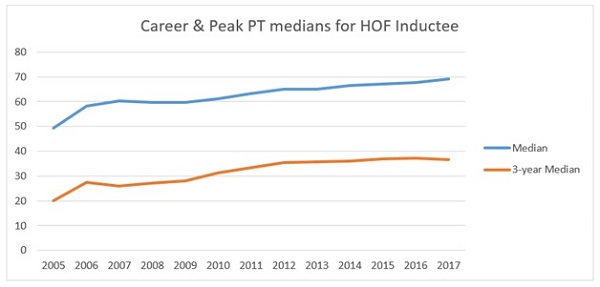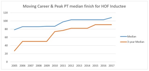 I think that helps explain how the HOF standards have gone down with regards to counting stats. Fewer PTs doesn't explain why the median finish at a PT has been steadily climbing. Increased competition likely is a factor, though I do not feel confident that it explains the full delta. I don't have anything to rationalize that beyond the thought that it just might not be the most important thing to voters. Maybe it never was. We're talking about pretty small samples, after all.