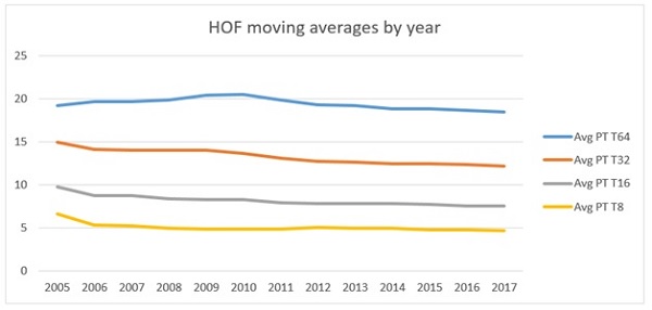 These are the HOF minimums3 as they have changed over time. As you can see, the number of top PT finishes has gone down and both medians have gone up, while Pro Points has remained the same. The first 2 of these indicate lower standards, not the higher standards we suspected. But that is deceptive, too. These are minimums, after all. There's only 1 way they can go. The minimum number of PT Top 8's inducted into the Hall cannot go up unless somehow the person with that minimum gets kicked out. So it makes sense that, over time, these numbers will become less restrictive or remain the same, as is the case with Pro Points. Let's instead look at averages. Maybe the average HOF player has changed.