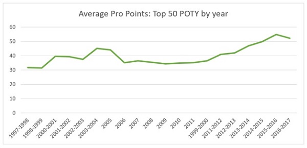 Pro Points are probably the most easily explained here. Simply put, Pro Points have become more accessible over the years. The increase in GPs and changing structures in point distribution have led to higher overall Pro Point totals. So that part checks out. People have had this discussion for years when comparing players from different eras. To further validate this though, here's the average number of Pro Points for the top 50 players in each season: