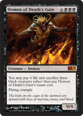 You may pay 6 live, and sacrifice three black creatures rather than pay Demon of Death's Gate casting cost.