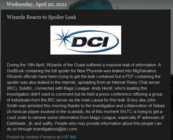 During the 19th April, Wizards of the Coast suffered a massive leak of information. A GodBook containing the full spoiler for New Phyrexia was leaked into MtgSalvation. Wizards officials have been trying to get the leak contained but a PDF containing the spoiler was also leaked in the internet, spreading from an Internet Relay Chat server (IRC), SolidIrc, connected with Magic-League. Andy Heckt, who's leading this investigation didn't want to comment but he held a press conference reffering a group of individuals from the IRC server as the main causa for this leak. B-boy aka John Smith was arrested this morning thanks to the investigation and collaboration of Sebas (A mexican player involved in the scandal). As of this moment WoTC is trying to get a court order to retrieve some information from Magic-League, especially IP adresses of Darkblade , jfc and waIfty. People who may provide information about this people can do so through investigations@dci.com.
