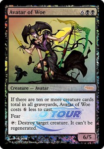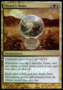 Every year Wizards and the DCI announce a promo card that will be distributed at each Pro Tour stop on that calendar, players receive one each time they attend and register to play at any marquee event. Even if it is multiple times at the same event. The card never changes during the season continuing from start to finish.