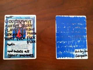 I have no idea what I was thinking when I started these. Nothing on these cards provides any semblance of coherent thought on the part of the alterer. I can say with a high degree of certainty that alcohol was definitely involved. I can apologize, or I can offer a cautionary tale of what happens when you mix unrealistic estimations of your own abilities with an infantile tolerance of alcohol and a nonexistent work ethic. Let’s get into this.