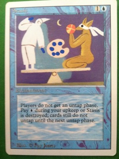 Stasis is a weird card. I have no idea what this art means. Actually, I don’t even know what the word Stasis means. Let’s look that shit up.