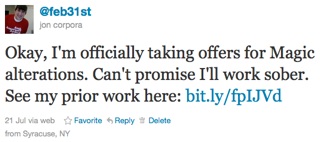 I’ll go out with an announcement I’m kind of excited about. Starting with my next article, I’ll be starting a column called “52 Decks in 52 Weeks,” in which I’ll go to FNM every week, trying to play a different deck each week. And I’ll be going every week. This is quite the commitment, seeing as I’m a full-time student for another year, and I live in Syracuse, New York, in all its lake-effect snowy glory. Also (more complaining), I don’t actually own very many cards, so I’ll be scrambling around every week to get cards from people, and since I don’t know many people around here (new to the area), and the ones I do know around here don’t actually like me (as has been documented on this website, I am a jerk), it should be a blast. But you should definitely look forward to the column—not for my tight plays and awesome decks, but because it’ll give me an outlet to grouse about Magic culture. Which is all I could ever ask for.