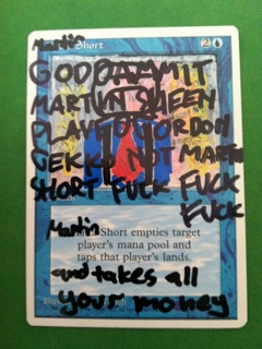 I thought since Mana Short sounds like “Martin Short,” I could just draw a picture of Martin Short on the card. Martin Short is the star of that movie Wall Street, where he plays Gordon Gekko, who, by my understanding, is the personification of the desired result of Reaganomics. In Wall Street, Martin Short wears suspenders and a tie and an angry face. Let’s draw Gordon Gekko.