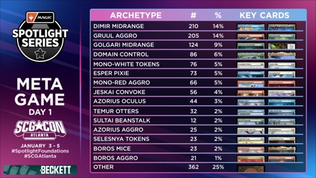 Multiple strategies saw representation with Dimir Midrange, Gruul Aggro, and Golgari Midrange taking the top three most popular decks. It's worth noting that while Gruul was 14% of the metagame, Mono-Red took an additional 5% and Boros took 1%, making Red Aggro the most represented archetype at around 20% of the field.