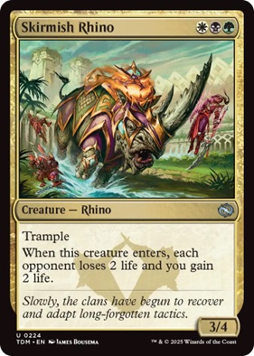 In similar fashion, Skirmish Rhino also feels too Midrange for this Standard meta. It feels too slow to combat a Red deck that has Heartfire Hero, Emberheart Challenger, and Monstrous Rage, and also is too small to make a dent in a deck with Overlord of the Hauntwoods and Up the Beanstalk. It kind of sits in this weird middle, being bad against both spectrums of the current Standard metagame. This isn't to say the card won't see play - we've only seen a small fraction of the set. My hope is that there are enough good Midrange cards in the next set to justify Midrange being a dominant force in Standard again (and I'm not counting Dimir mainly creatures + Kaito a traditional Midrange deck!).