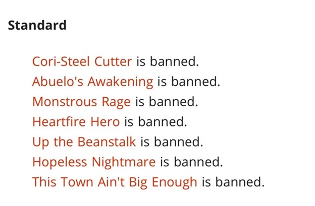 Honestly, these cards all needed to go, and I don't think people are surprised by these bans. Heartfire Hero scales too quickly in Aggro, Monstrous Rage eliminates blocking in creature matchups, and Cori-Steel Cutter is just a messed up Magic card. I think having Aggro as a dominant archetype in a given Standard meta is actually a good thing, and smaller metas help you adapt better. The absence of Aggro leads me to believe the format will have more diversity, but it will be harder to prep for everything. Whether that's good or bad is up to you, but I do think they did ban some pretty unfun cards to play against.